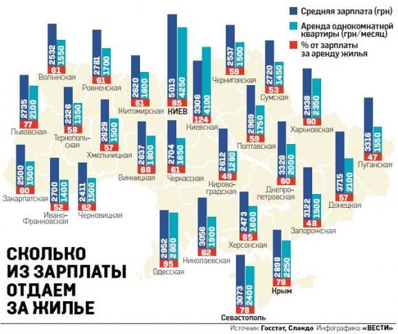 По словам эксперта консалтинговой компании SV Development Сергея Костецкого, за 2012 год цены на аренду квартир по Киеву выросли на 20%, а по стране — на 8–13%. За полгода 2013-го рост составил 5%. Дороже всего арендовать квартиры в Киеве, Харькове, Крыму и Одессе. «С Киевом все понятно — это город, куда люди со всей страны едут работать. Харьков — город с развитой инфраструктурой и студенческая столица. Именно эта категория подогревает спрос на жилье. В курортных Одессе и Крыму — традиционный взлет цен летом и плавное снижение, начиная с ноября», — говорит эксперт. Дешевое жилье — только в дотационных регионах севера и запада страны, где традиционно зарплаты не превышают 2,5 тыс., а за квартиру просят не более 1,5 тыс. Исключение — Львов, где в среднем зарабатывают 2,7 тыс., а за квартиру отдают 2,1 тыс. Рост цен на аренду в столице Галичины связывают с наплывом туристов, готовых снимать квартиры по 200–400 грн в сутки.