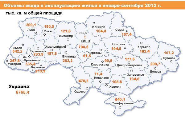 Четвертое и пятое место по количеству введенного жилья заняли Крым и Одесская область, где было сдано 540,1 тыс. кв. м и 470,5 ты. кв. м жилья соответственно. При этом в АРК объемы увеличились в 2,5 раза, в сравнении с минувшим годом. Большой рывок сделали в Запорожской, Волынской, Кировоградской, Луганской и Черновецкой областях. А вот Севастополь и Харьков, наоборот, сбавили обороты. Аутсайдерами в данном сегменте рынка недвижимости стали Черкасская (введено 61,5 тыс. кв. м), Николаевская (71,4 тыс. кв. м) и Кировоградская (90,6 тыс. кв. м) области, недотянувшие до 100-тысячной планки.