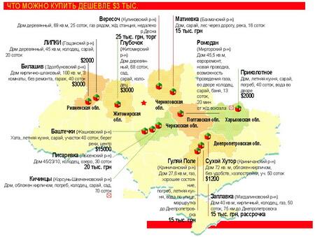 Сейчас на Полтавщине за $3 тыс. можно купить старую деревянную хатку с 20 сотками земли в селе Яхныки (Лохвицкий р-н) или обложенный кирпичом дом с 40 сотками земли в с. Березоточа (15 км от Лубен).