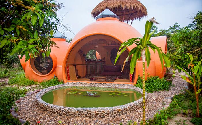 Купольный домик Стива Этот компактный яркий домик Стива Арина, стоимостью 9 000 долларов, спрятался в зарослях манговых деревьев одной из ферм Таиланда. Стив спроектировал и построил домик самостоятельно с помощью друга и его семьи. При строительстве были использованы экологические материалы и традиционные цементные блоки и кирпич. Это жильё наглядно демонстрирует, насколько маленький домик может быть ярким и интересным.