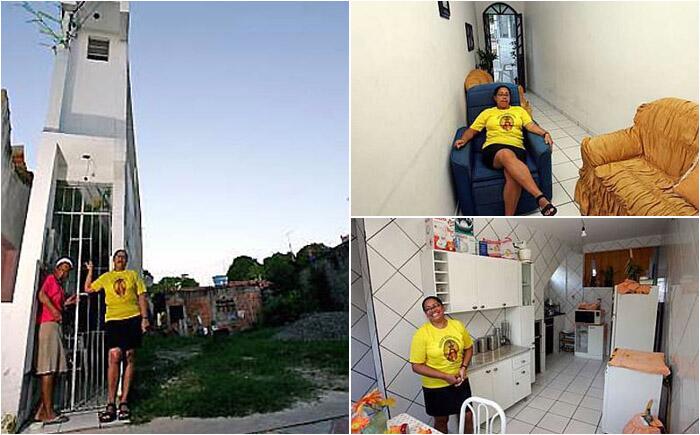 Самый узкий дом в мире Этот домик шириной 1 метр и высотой 10 метров находится в одном из бразильских городков. Владелец и дизайнер домика, Хеленита, гордится своим творением, ей пришлось даже отвоевать его у местных властей, так как строительство не разрешали. В доме три этажа, но дизайнер планирует добавить еще один, чтобы найти место для принятия солнечных ванн и барбекю. Он быстро стал туристическим объектом, и хозяйка с удовольствием всем его демонстрирует. Впрочем, узкими домами теперь радуют не только любители, но профессиональные архитекторы, например, парижская архитектурная фирма Triptyque.
