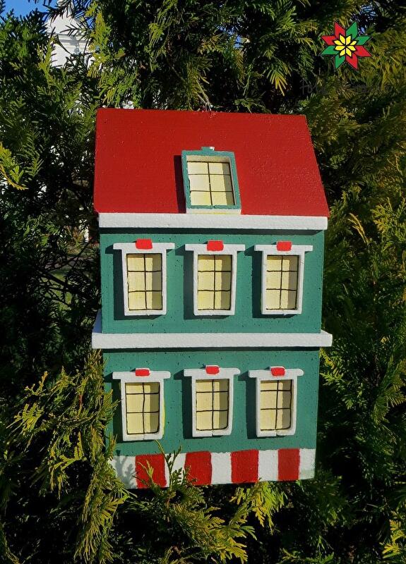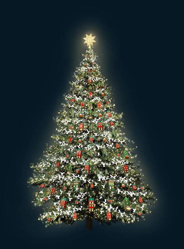 Дизайн. На елку повесят игрушечные домики.