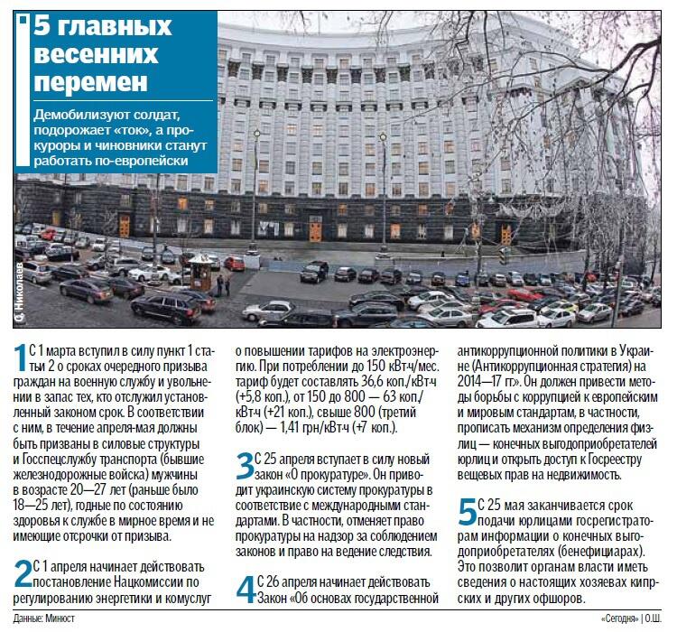 В ближайшие три месяца украинцев ждут новые тарифы, демобилизация, перемены в работе прокуроров, борьба с коррупцией и повышение цен на алкоголь. "Сегодня" проанализировала изменения, которые вступят в силу этой весной (самые важные из них — в инфографике. — Авт.).