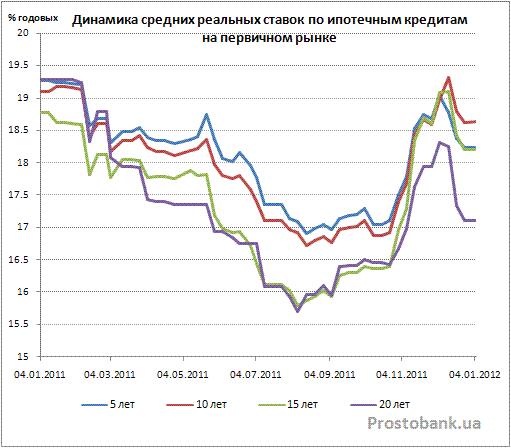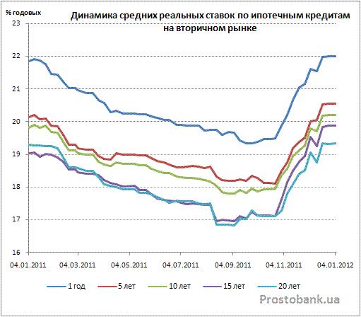 Средние реальные ставки по кредитам на покупку жилья на вторичном рынке первые восемь месяцев 2011 года уверенно продолжали тенденцию 2010 года и снижались, вселяя надежду в потенциальных заемщиков. В итоге, по состоянию на 05.09.2011 г., по данным компании «Простобанк Консалтинг», средняя ставка по кредитам на покупку вторички сроком на 20 лет составляла уже 16,84% реальных годовых. В последний раз столь низкая стоимость кредитов на рынке наблюдалась лишь в лучшие месяцы далекого 2008 года: по данным компании «Простобанк Консалтинг» на 14.01.2008 г., средняя ставка по займам сроком на 20 лет составляла 16,5% реальных годовых, а немногим позже, в августе-2008, она уже выросла до 21,4% реальных годовых.