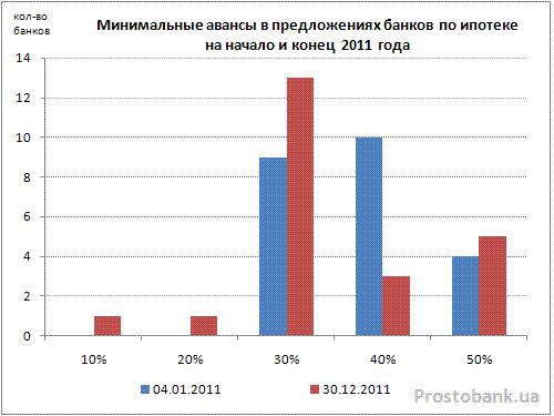Итоги 2011 года с точки зрения первоначальных взносов по ипотеке можно было бы назвать относительно успешными: на рынке появились давно невиданные предложения с авансом в 10% и 20% от суммы кредита на покупку жилья на вторичном рынке. Кроме того, увеличилось количество предложений с авансом 30% - с 9 в январе-2011 до 13 в декабре-2011. Тем не менее, несмотря на прецедент, первоначальный взнос не более 20% есть всего у двух банков, а на рынке отслеживается тенденция уменьшения среднего аванса.
