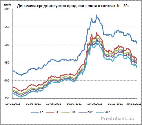 Несмотря на стремительно растущий в 2011 году спрос на золото в слитках, количество банков, работающих с этим металлом, за год немного сократилось. На одно учреждение уменьшилось число банков, работающих со штампованными слитками весом 1, 5 и 20 грамм (слитки этого веса престал предлагать ПриватБанк и Проминвестбанк, но предложил ВТБ Банк), на два учреждения поредели ряды банков-продавцов слитков весом 10, 50 и 100 грамм (помимо вышеперечисленных изменений, из этого сегмента ушел банк «Финансы и Кредит»), и на четыре банка меньше стали предлагать слитки весом 500 грамм (от них, кроме перечисленного, отказались Индустриалбанк и Банк Форум). Наконец, количество банков, продающих килограммовые слитки, не изменилось, но здесь выбывший Индустриалбанк заменил ВТБ Банк. В итоге, к концу года полукилограммовые слитки стали наименее популярными среди банков: их предлагали лишь 12 учреждений, тогда как слитки весом килограмм предлагали 13 банков, а слитки меньшего веса – 19-20 банков.
