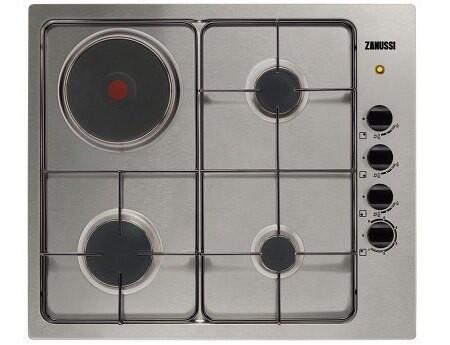 Комбинированная варочная панель Zanussi (газ и электрическая чугунная конфорка). Поверхность: нержавеющая сталь.