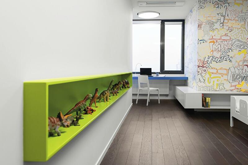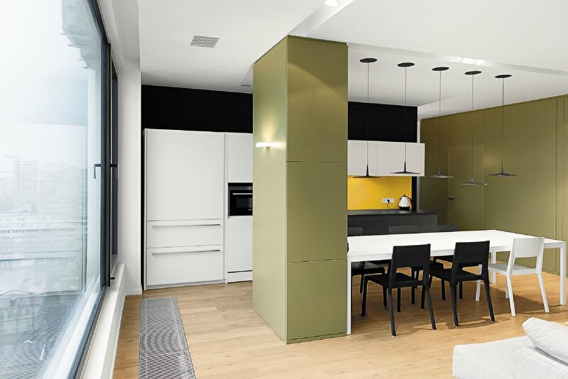 Квартира традиционно поделена на две части. Общественная состоит из гостиной-столовой; приватная включает спальню, детскую, ванную комнату и санузел. Зоны разделены блоком, в котором обустроены гардероб, санузел и кухонные шкафы. Цвета использовано немного. В основном это монохромные сложные оттенки серого, белого и черного с яркими вкраплениями индиго, желтого и шартрез, придавшими несколько анемичному пространству динамику и «звучание».