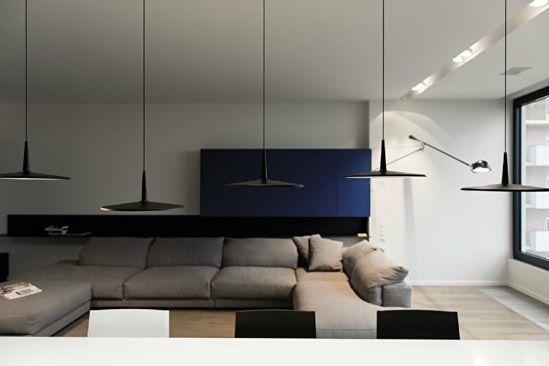 В интерьере задействовано много оригинальных подсветок, благодаря которым каждая из предметных инсталляций живет своей жизнью, не нарушая, однако, цельности общего впечатления. Главную скрипку светового сценария играют «летающие объекты» от Vibia. Легкие и изящные, они формируют характер интерьера – артистичный и функциональный. Часть предметов выполнена по авторским эскизам.