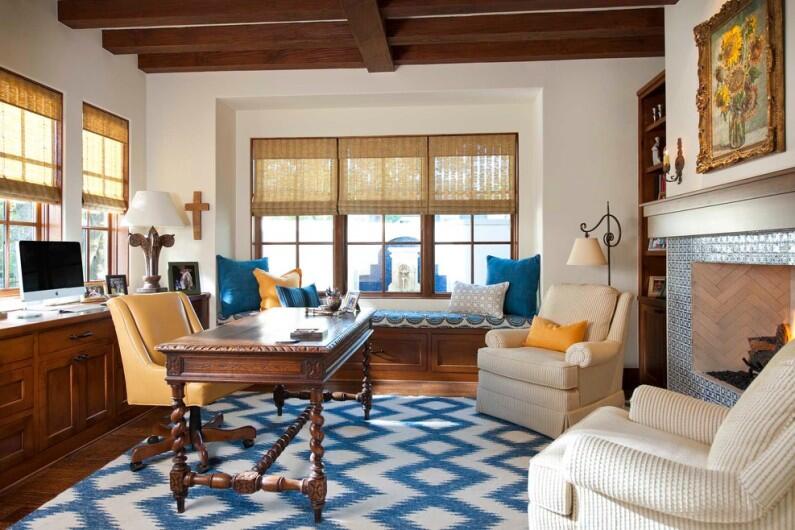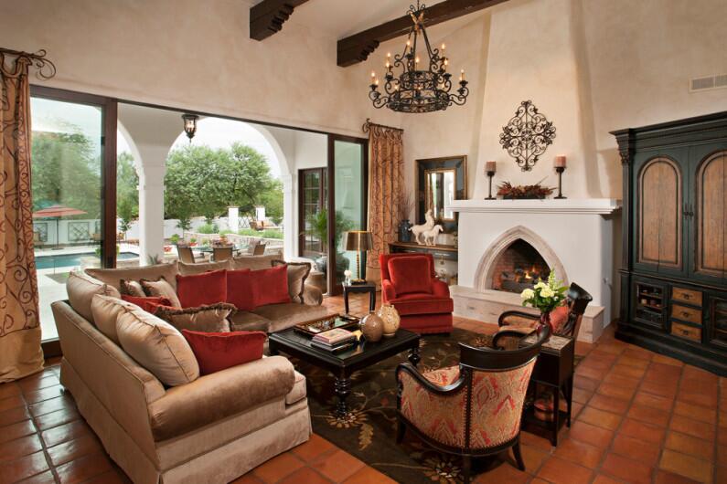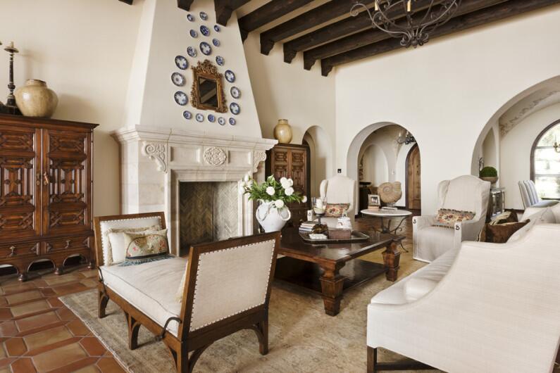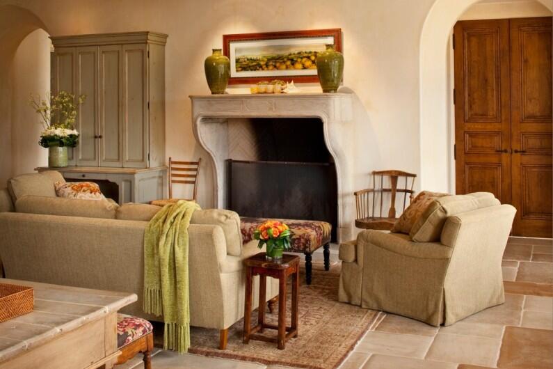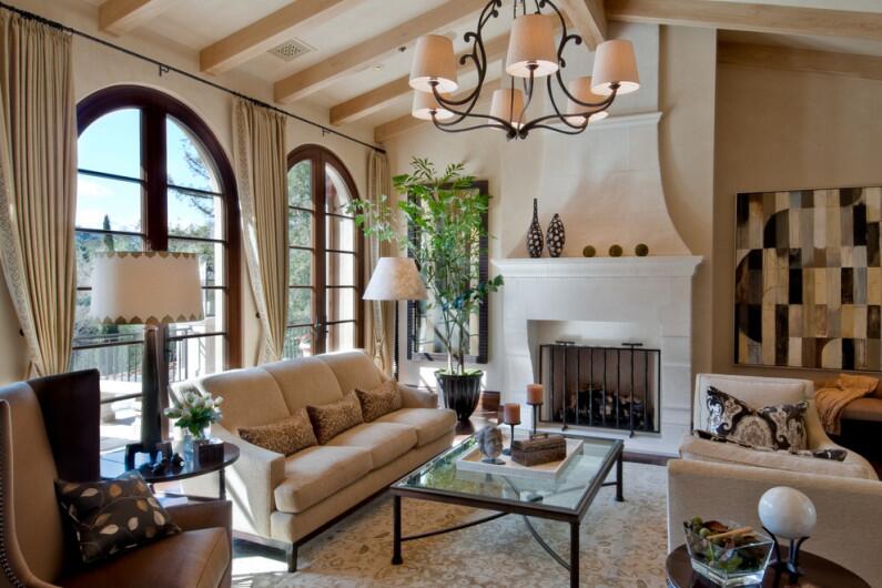 Декоративное убранство средиземноморских гостиных не отличается изысканностью, но подчеркивает располагающий характер обстановки. К примеру, украшением помещения могут быть различные керамические сосуды, расписанные тарелки, глиняные горшочки и амфоры. К стене у камина уместно прикрепить кованные подсвечники, а рядом на полу поставить пару таких же медных или, опять же, с основой из керамики.