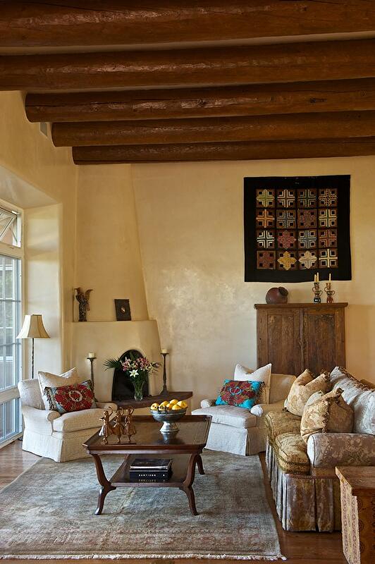 Чаще всего, цвет деревянных балок перекликается с тоном дверных проемов и оконных рам, которые также визуально выделяют с помощью дерева. Металл используйте в виде ковки, но только в том случае, когда, как упоминалось выше, интерьер гостиной склоняется к итальянскому средиземью.