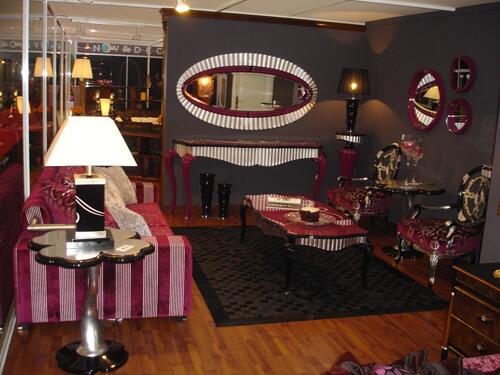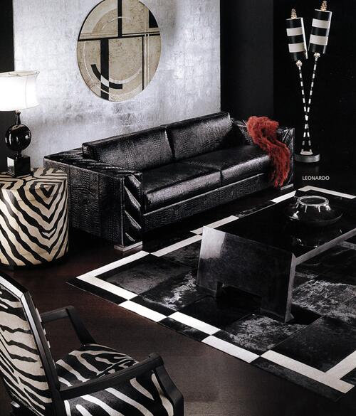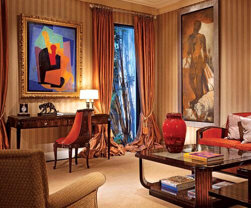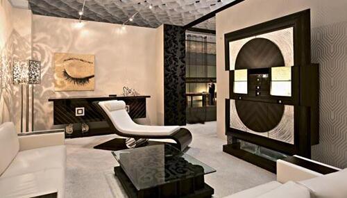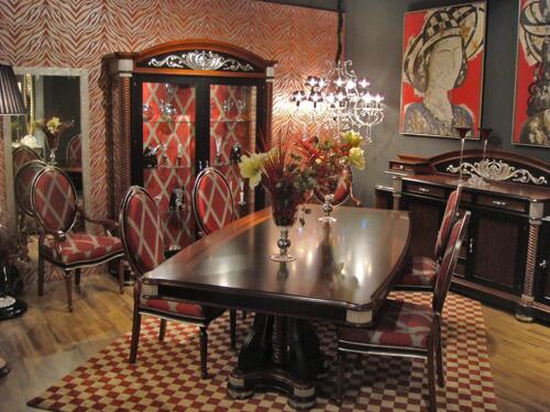 Характерные элементы интерьера : слоновая кость, черное – эбеновое дерево, перламутр, бриллианты, кожа, даже «шкурки ящериц» и кожа крокодила, произведения из фарфора, металла, стекла необычной формы, а также «пышная, вызывающая декоративность набивных ситцевых тканей».