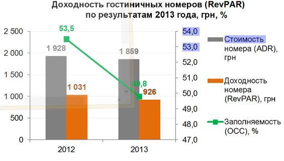 По данным Colliers International, в среднем запрашиваемая стоимость номера "на стойке" по состоянию на конец марта 2014 года понизилась по сравнению с аналогичным периодом в прошлом году (в евро): на 10%, в отелях категории 5* и составила €365, на 25%, в отелях категории 4* - €133 и на 20%, в отелях категории 3* - €77. Вместе с тем в гривневом эквиваленте заявленная стоимость выросла на 130%, в отелях категории 5* и составила 5500 грн; на 110%, в 4* - 1 990 грн. и на 110%, в 3* - 1150 грн.