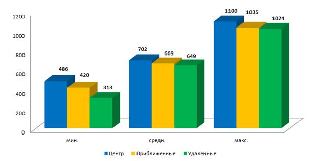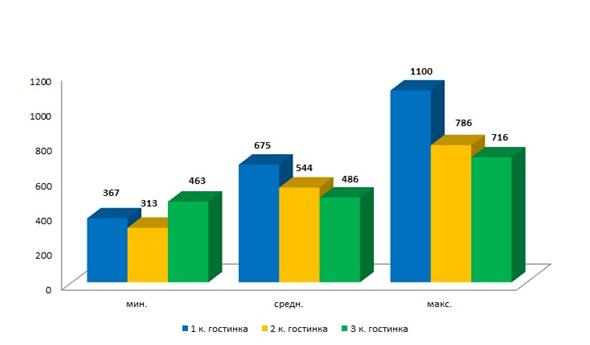 Минимальная стоимость на квартиру гостиничного типа была зафиксирована на уровне – 313 долл.США/кв.м. в удаленном районе г. Харькова. Максимальная цена в период февраль 2014 – февраль 2015 года была зафиксирована на квартиру гостиничного типа на уровне – 1100 долл.США/кв.м. в центральной части г. Харькова(рис.1).