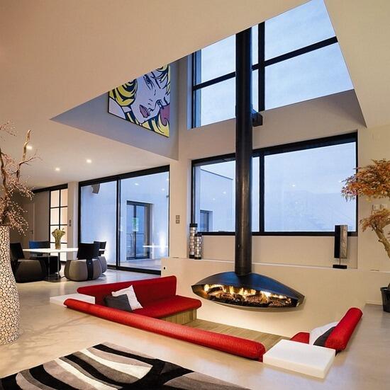 Интересна идея сделать гостиную-впадину с камином: очаг всегда привлекает к себе, заставляя гостей сесть вокруг него поближе, а в уютной гостиной, расположенной в углублении ниже уровня пола будет еще приятнее сидеть у живого огня.