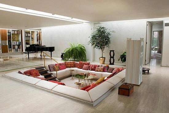 Авторы концепции гостиной ниже уровня пола утверждают, что такой метод организации пространства располагает к беседам, общению с гостями и способствует взаимопониманию. Как правило, планируя дизайн интерьера квартиры , мы предполагаем, что иногда мы будем принимать гостей и хотим, чтобы им было комфортно у нас дома. В этом случае гостиная-впадина просто идеальный вариант: ограниченное пространство психологически влияет на собеседников, создавая атмосферу непринужденного общения.