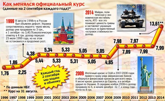 Скажем прямо: начиналось все замечательно. В далеком 1996-м курс новой украинской валюты к доллару был меньше 2 (подробнее см. инфографику), так что жить вполне можно! За первые два года гривна девальвировала на 20%, что, конечно, многовато, но, как показали последующие события, вполне сносно. А потом понеслось!
