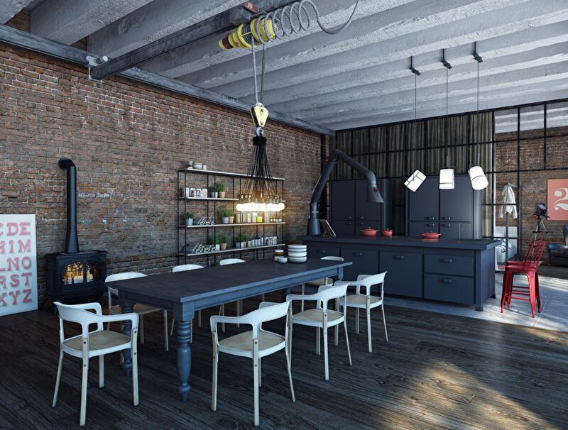 Над столом расположился подвесной светильник из 85 лампочек Droogs Design, подвешенный на крюк цехового крана, благодаря которому светильник можно регулировать по высоте и перемещать в любую точку помещения. У стены находится небольшой чугунный камин.
