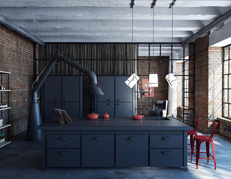 Центром кухни является многофункциональный остров Minaprofessional в индустриальном стиле. Окрашенный в графитовый цвет, в паре с вентилями помидорно-красного цвета он напоминает кузню. В комплект к острову подобраны шкаф и холодильник. Дополняет эту композицию истинно дизайнерский объект – вытяжка Mammut, имитирующая конструкцию промышленных вытяжных систем.