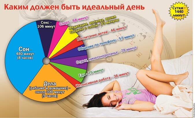 Сколько человеку надо для счастья? Около часа в день на кино, столько же на телефонные разговоры и почти вполовину меньше на интенсивную работу. Главная же составляющая идеального режима суток – интим.