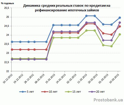 Есть хорошие новости и для украинцев, желающих рефинансировать свой старый ипотечный кредит. В феврале-2013 средние реальные ставки по кредитам рефинансирования снижались в унисон рыночным тенденциям, хоть и незначительно. В частности, по исследованию компании «Простобанк Консалтинг» они уменьшились на 0,09-0,21 процентного пункта по кредитным программам сроком от 5 до 15 лет. Неизменными остались лишь средние ставки по кредитам рефинансирования на 20 лет.