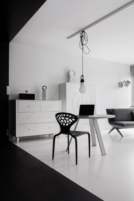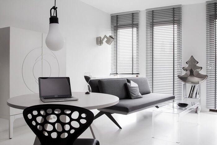 Чёрно-белый интерьер смотрится очень динамично. Он подходит для людей, которые находятся в постоянном движении и ведут активный образ жизни. В таком пространстве важно не только соблюсти баланс между чёрным и белым, но и правильно подобрать мебель. Чёрно-белая цветовая гамма любит нестандартные геометрические решения. Например, как в этом интерьере использовали большое разнообразие форм, тем самым компенсировали однообразие цветовой гаммы. Неправильные овалы, строгие прямоугольники, абстрактные круги – все эти фигуры работают на то, чтобы отвлечь внимание от небольшой площади.