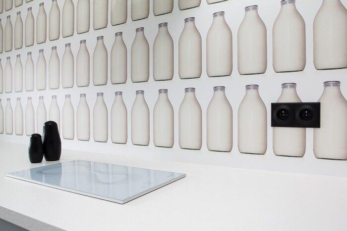 Главное правило при работе с чёрным и белым – они не должны использоваться в равном количестве. Один из цветов должен преобладать – в этой квартире главенствует белый. Также её интерьер разбавлен вкраплениями серого и бежевого оттенков. Они выступают в роли связующих звеньев. Например, лёгкий серый цвет используется на одной из стен и в кухонных фасадах, а бежевый можно наблюдать в зоне кухни, где рабочую зону обозначили довольно необычными обоями.