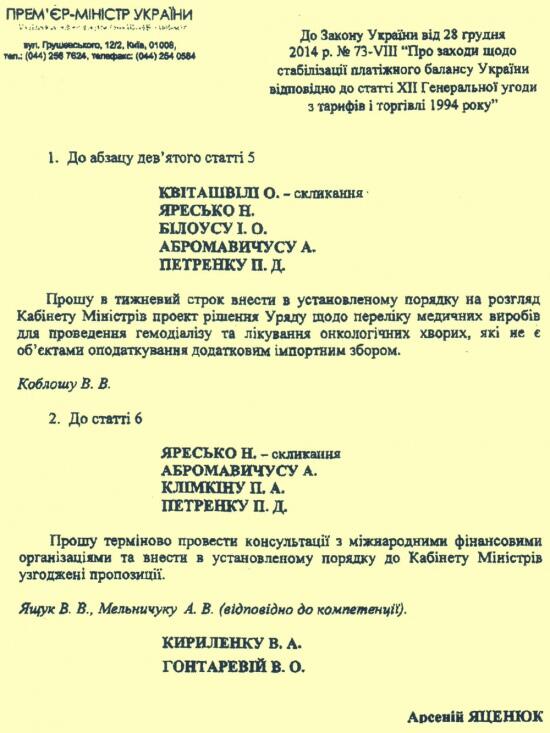 16 января премьер Арсений Яценюк поручил министру здравоохранения Александру Квиташвили и другим членам правительства подготовить список лекарств, импорт которых не будет облагаться этим сбором.