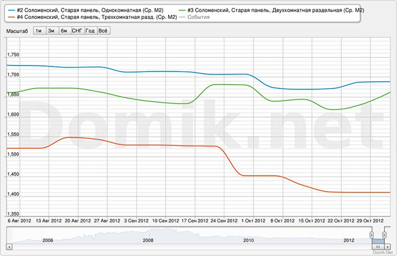 Зеленая кривая – статистика цен предложений на двухкомнатные раздельные квартиры в Соломенском районе в сегменте «старая панель».