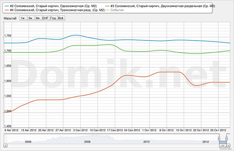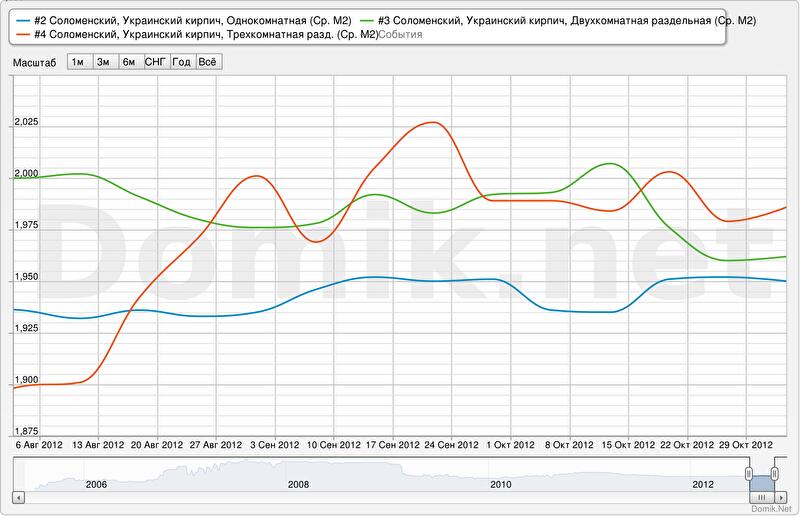 Зеленая кривая – статистика цен предложений на двухкомнатные раздельные квартиры в Соломенском районе в сегменте «старый кирпич».