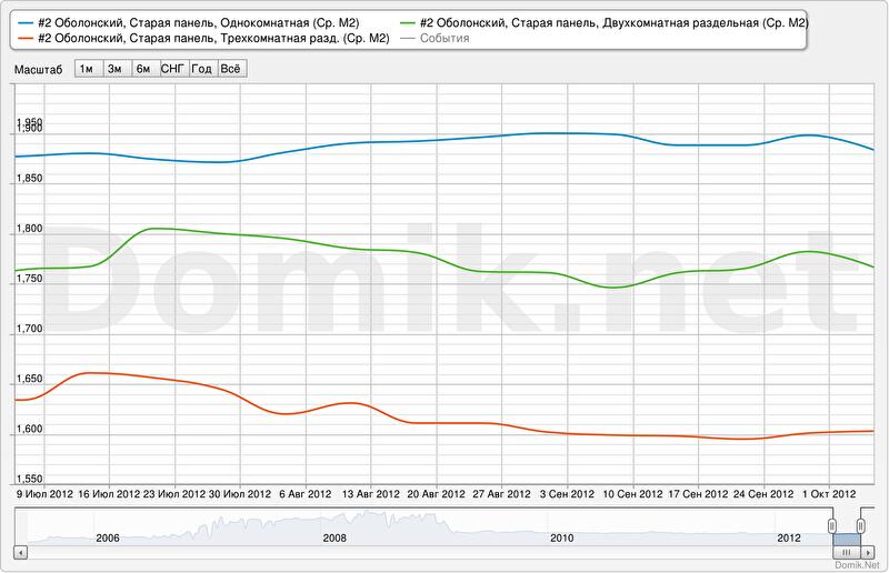 Зеленая кривая – статистика цен предложений на двухкомнатные раздельные квартиры в Оболонском районе в сегменте «старая панель».