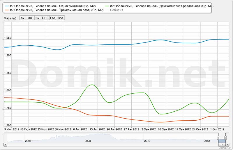 Зеленая кривая – статистика цен предложений на двухкомнатные раздельные квартиры в Оболонском районе в сегменте «типовая панель».