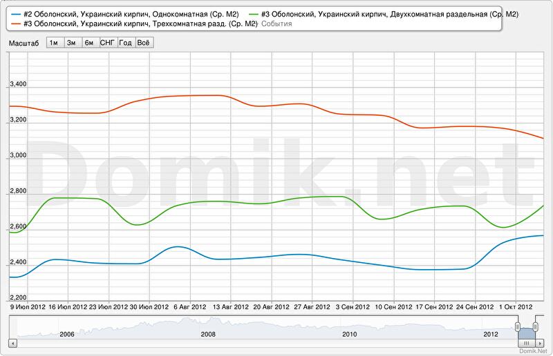 Зеленая кривая – статистика цен предложений на двухкомнатные раздельные квартиры в Оболонском районе в сегменте «украинский кирпич».