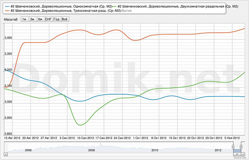 Зеленая кривая – статистика цен предложений на двухкомнатные раздельные квартиры в Шевченковском районе в сегменте «дореволюционные».