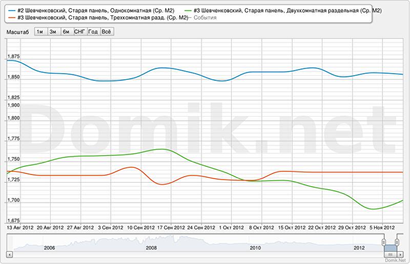Графики изменения статистики цен предложений по всем сегментам рынка представлены //domik.ua/nedvizhimost/dinamika-cen.html . Ниже приведена статистика цен предложений в наиболее массовых сегментах рынка Шевченковского района