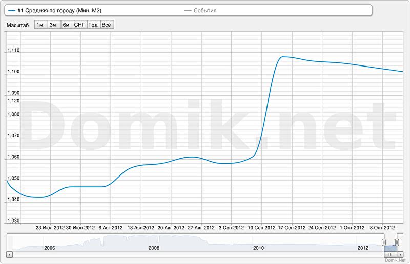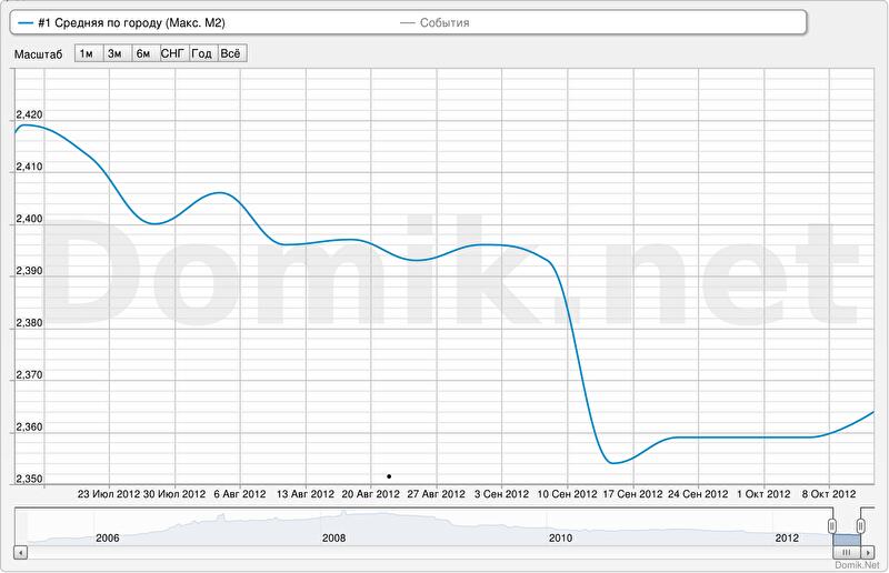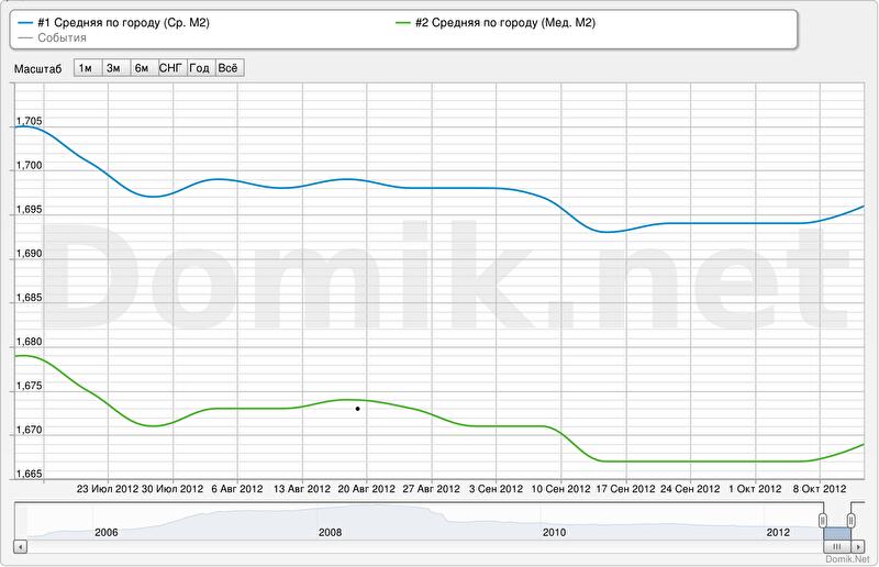 Графики изменения статистики цен предложений по всем сегментам рынка представлены //domik.ua/nedvizhimost/dinamika-cen.html . Ниже приведены графики изменения статистики цен предложений квадратного метра в среднем по всему городу, а также в наиболее «дешевых» и «дорогих» сегментах рынка.