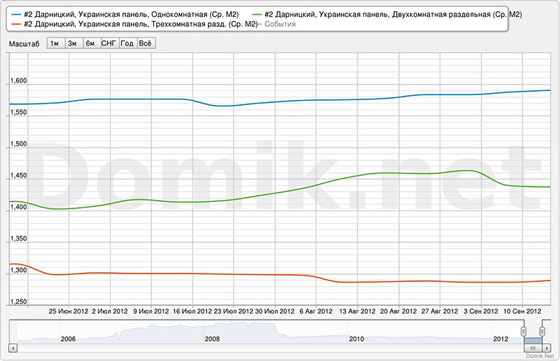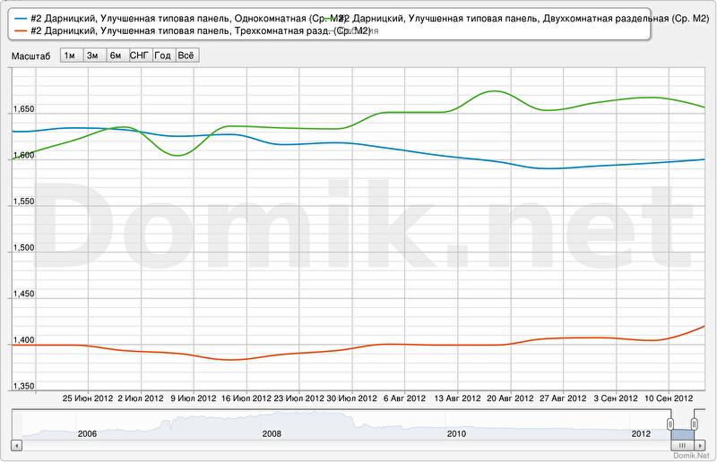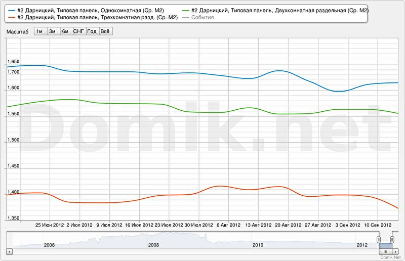 Графики изменения статистики цен предложений по всем сегментам рынка представлены //domik.ua/nedvizhimost/dinamika-cen.html . Ниже приведена статистика цен предложений в наиболее массовых сегментах рынка Дарницкого района. Аналогичные графики для других районов планируем опубликовать в ближайшие недели.