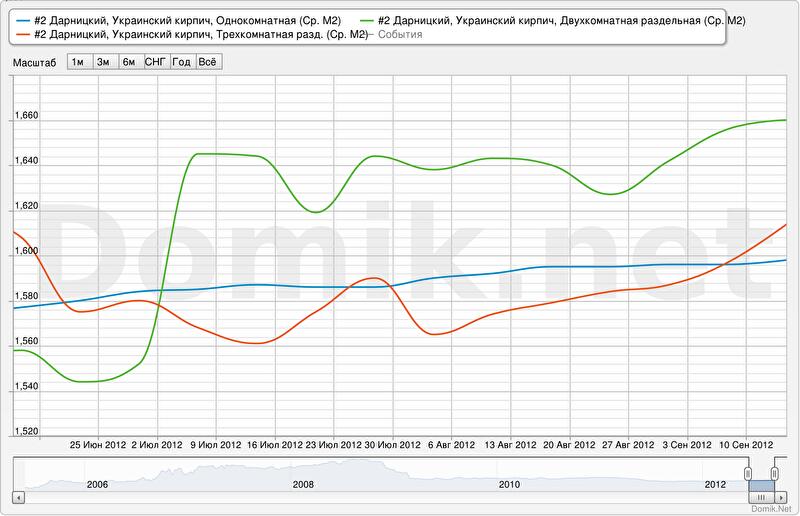 Зеленая кривая – статистика цен предложений на двухкомнатные раздельные квартиры в Дарницком районе в сегменте «украинский кирпич».