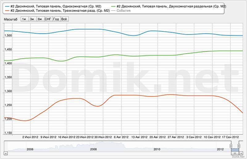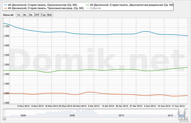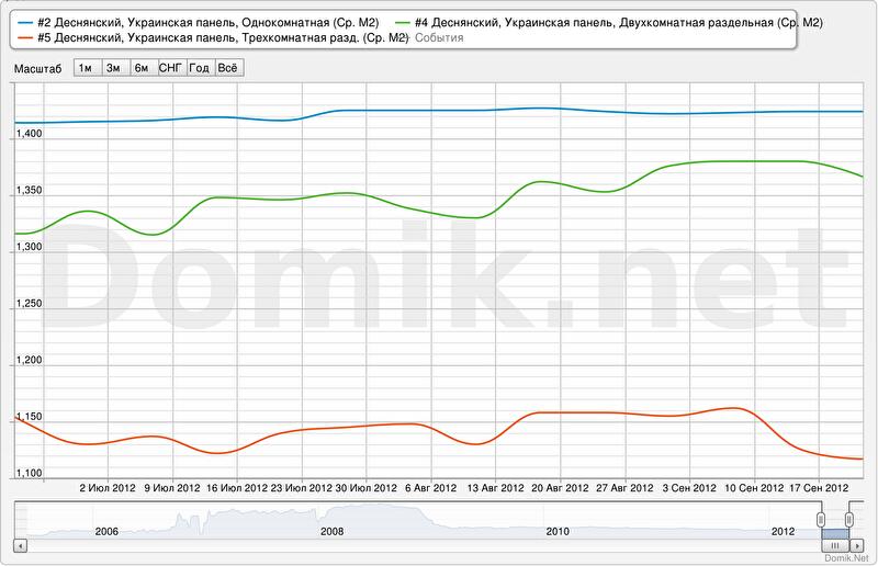 Графики изменения статистики цен предложений по всем сегментам рынка представлены //domik.ua/nedvizhimost/dinamika-cen.html . Ниже приведена статистика цен предложений в наиболее массовых сегментах рынка Деснянского района . Аналогичные графики для других районов планируем опубликовать в ближайшие недели.