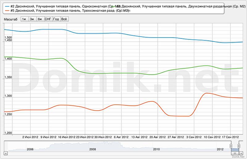 Зеленая кривая – статистика цен предложений на двухкомнатные раздельные квартиры в Деснянском районе в сегменте «старая панель».