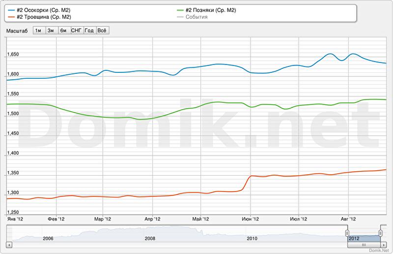Графики изменения статистики цен предложений по всем сегментам рынка представлены //domik.ua/nedvizhimost/dinamika-cen.html . Ниже приведена статистика цен предложений в новостройках на тех жилых массивах, где в последнее было возведено достаточно много жилых домов. Цены на графиках приведены в долларах за квадратный метр. Методы аппроксимации при построении данных графиков не использовались.