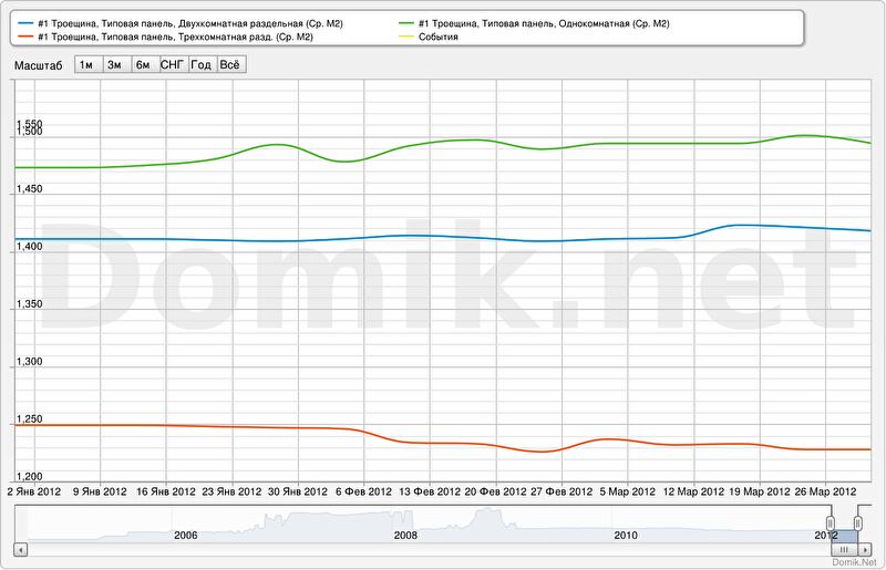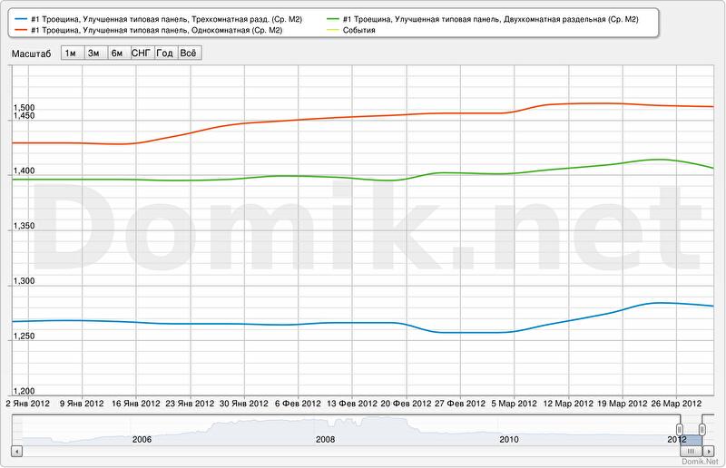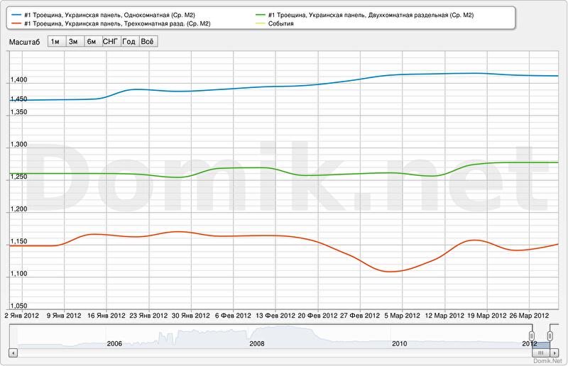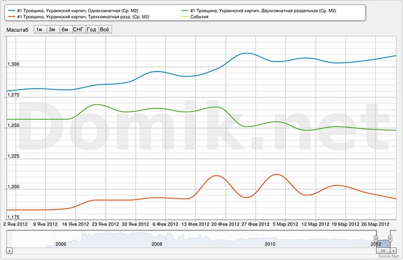 В качестве примера приведены графики изменения статистики цен предложений на одно-, двух- и трехкомнатные квартиры на Троещине. Все эти графики сформированы новым сервисом.