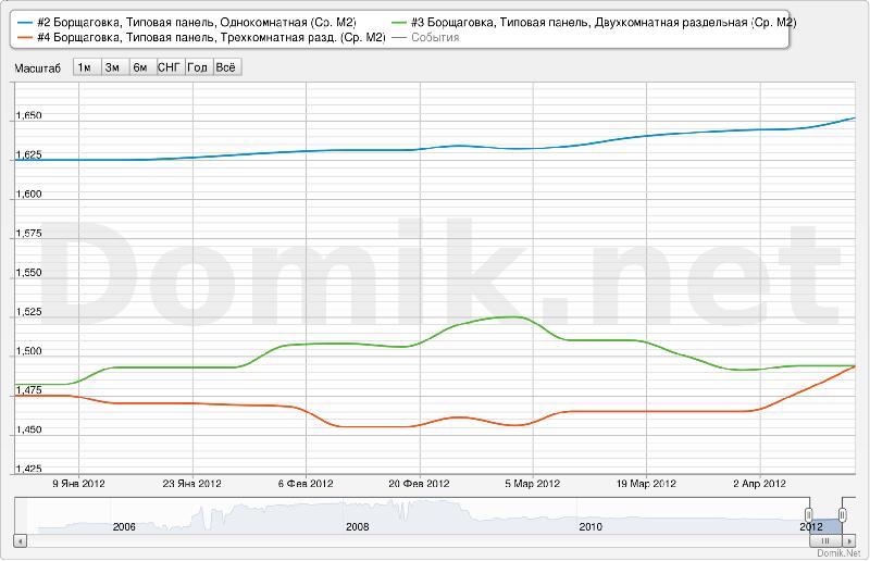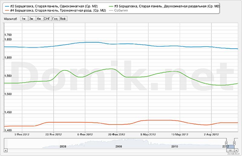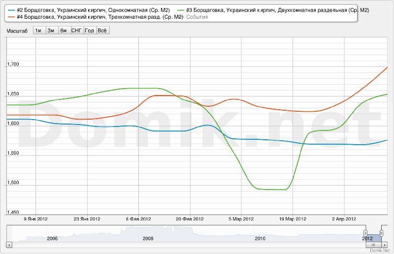 Графики изменения статистики цен предложений в отдельных сегментах рынка недвижимости предложений по Киеву приведены ниже. В качестве примеров были выбраны наиболее распространенные и характерные типы жилья на одном из крупнейших жилых массивов Киева – Борщаговке.