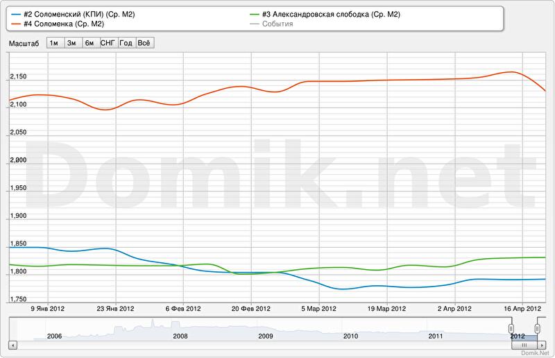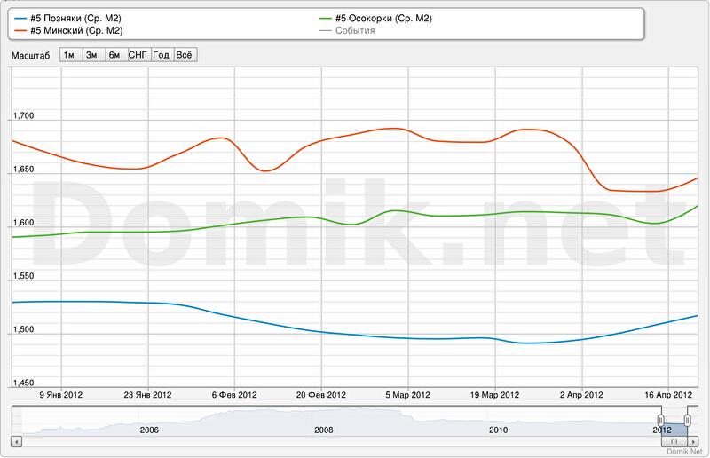 Как видно на приведенных графиках, тенденции изменения статистики цен предложений в различных сегментах новостроек имеют различные тенденции. На одних жилых массивах цены предложений растут, на других достаточно стабильны, на третьих снижаются. При этом рост в последнее время наблюдается не только на таких престижных массивах как Нижний Печерск и Оболонь, но и на Троещине.
