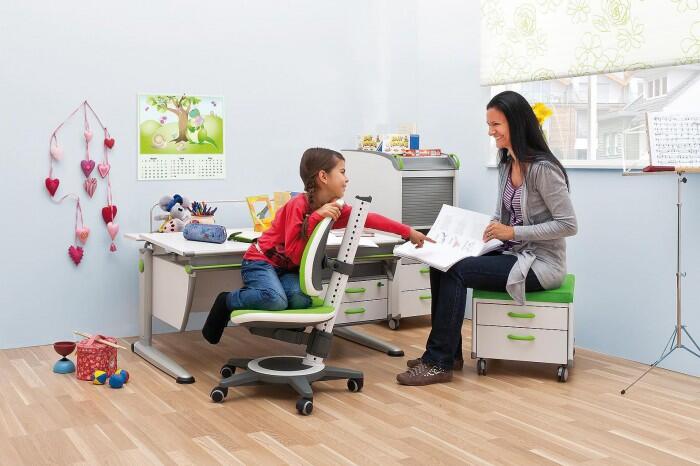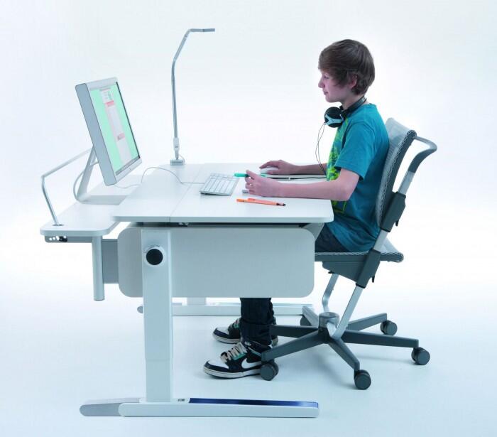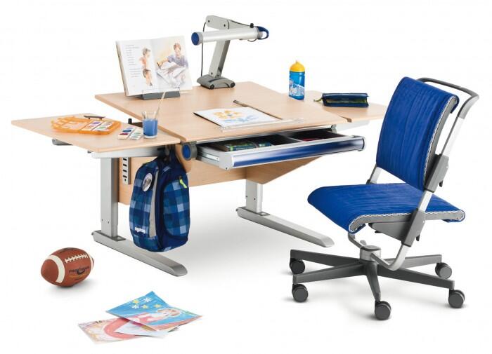 Высоту стола следует установить такую, чтобы столешница находилась на уровне солнечного сплетения ребенка, локти не свисали, а плечи не были напряженными. Не менее важно, чтобы у стола регулировался угол наклона столешницы – это снимает нагрузку с шейных отделов позвоночника и не дает ребенку сильно наклоняться вперед. Рекомендуемый угол наклона для рисования – 5 градусов, для письма – около 15 градусов, для чтения желателен больший угол наклона – 25-30 градусов. Столы Moll не только соответствуют данным требованиям, они также оборудованы удобными, надежными и безопасными механизмами трансформации: нужный угол наклона ребенок может отрегулировать самостоятельно, без лишних усилий и риска прищемить пальчики. В комплекте со столом идет удобная подставка для книг, которая крепится к столешнице, практичные ящики и контейнеры для хранения канцелярских принадлежностей, а также крючок для школьной сумки или рюкзака.