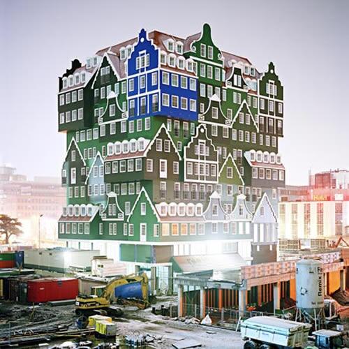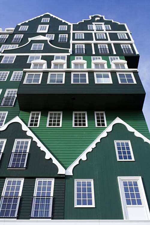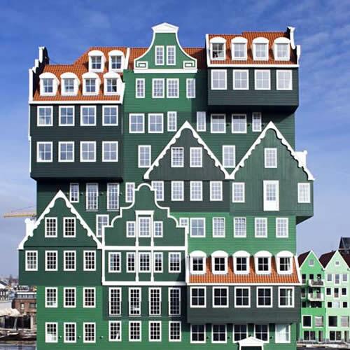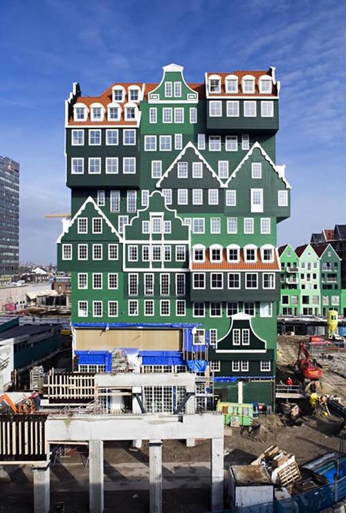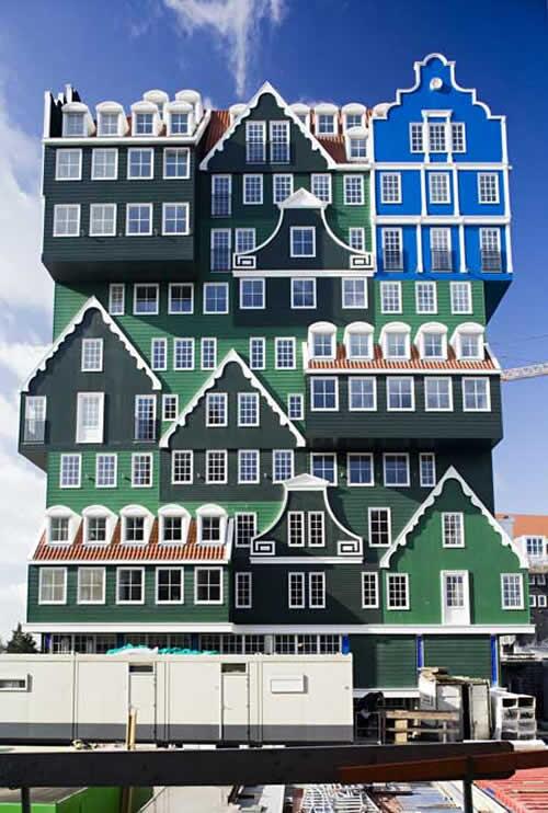 Еще до открытия "Inntel Hotel" привлек к себе внимание прессы, что не удивительно – отели такой необычной конструкции появляются нечасто. И, хотя он производит впечатление довольно хрупкого здания, в посетителях отбоя нет. Выступы здания создаются не конструктивными особенностями, а декоративными и навесными элементами. Только в нескольких местах имеются реальные консольные выступы стен, но это очень несложно выполнить и на общую стойкость здания такие конфигурации на влияют. Основная масса "домиков" – это просто прилепленные "крыши" и "фасады", которые вкупе с индивидуальной конфигурацией окон для каждого "домика" создают впечатление отдельной жилой единицы. Все это создано на вполне обычной "коробке", но выполнено достаточно виртуозно.
