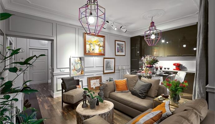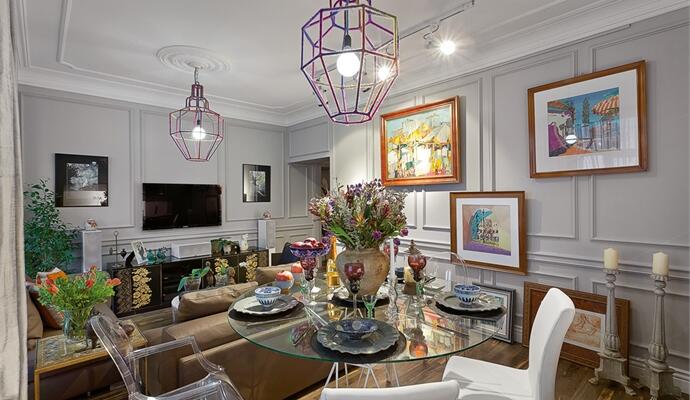 Квартира, в общем-то, киевская — но только географически. Легкая небрежность, с которой развешены-расставлены картины, смелое сочетание цветов, французские панели и неприкрытый артистизм в антураже неоклассики почему-то сразу навевают образы богемных студий Латинского квартала. Впрочем, ломать стереотипы — это в стиле Махно. Пора отбросить комплекс вторичности и просто признать: в Украине можно делать не менее интересно и даже ярче. Играя с фактурами, материалами и цветом, в своих проектах Сергей постоянно нарушает правила — то положит паркетную доску на стены, то на потолке устроит «тетрис» из простых люминесцентных ламп. Для собственной квартиры он вдвойне не пожалел идей.