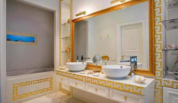 Архитектурных и дизайнерских экспериментов не избежала и спальня. Здесь архитектор выстроил дополнительную стену, разграничив зону сна и вход в ванную комнату. Хозяин же проявил талант декоратора. Сетуя на то, что в Украине сложно найти хороших текстильщиков, он сам разработал дизайн покрывала, подушек, штор и мебельной обивки. Морскую тему в нежных песочно-кремовых тонах «поддержал» деталями: французские светильники оклеил ракушками и морскими звездами, на стены повесил графику одной из художниц своего ателье. В ванной поиграли с аллюзией на классику и средиземноморский стиль, смело задействовав современные технологии: нарядная белая плитка и золотой мозаичный меандр вовсе не спорят со светодиодной подсветкой. Свободное обращение со стилями, смелость микширования, бесчисленное множество идей, радость жизни, легкость бытия — все это об этой квартире. А может о ее хозяине?