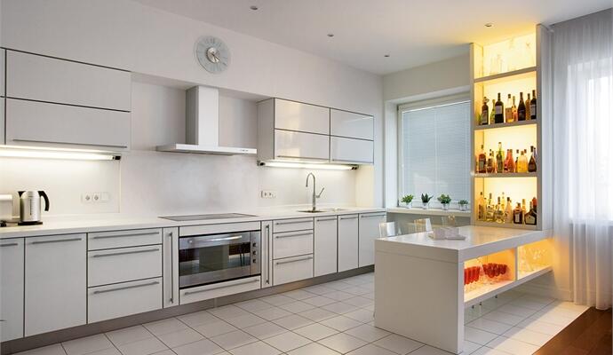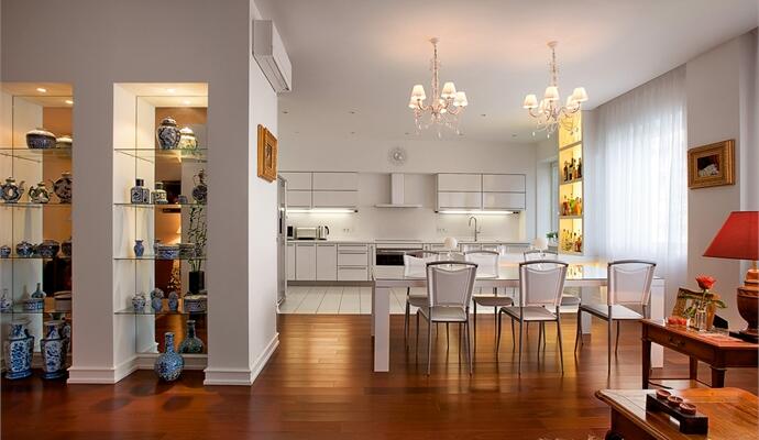 Дальше — больше: абсолютно белое футуристическое пространство кухни. Чистые минималистские линии беспощадно заявляют о себе сквозь «буферную» зону столовой с гламурными белоснежными люстрами, нависающими над белым столом. Декораторским лейтмотивом, объединяющим все помещения общественной зоны, является серия «классических» картин. При их рассмотрении обнаруживается интересный ход. Это копии известных полотен известных художников. Однако в основе сюжета — не знаменитая, тиражированная сцена, а «второстепенный» фрагмент, тот, который часто остается вне зоны внимания неискушенного зрителя. Интересны и архитектурные детали. Стена с книжным шкафом, которая от входа прикрывает пространство гостиной, со стороны гостиной является функциональной панелью под TV, аудио- и видеоаппаратуру. Со стороны же «библиотеки» шкаф сделан таким образом (по эскизам архитектора), что нижние дверцы скрывают соединительные шнуры и кабели питания от аппаратуры в гостиной. Зону столовой очерчивает и делает уютной стена-перегородка, в которой с одной стороны разместились витрины с коллекцией фарфора, а с другой — закрытые системы хранения. Как уже упоминалось, благодаря этому элементу, остается целостная «классическая» композиция входной группы, а кроме того, появляются дополнительные функциональные зоны.