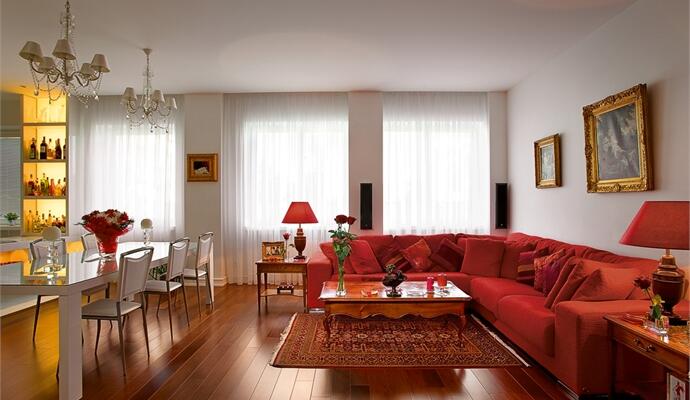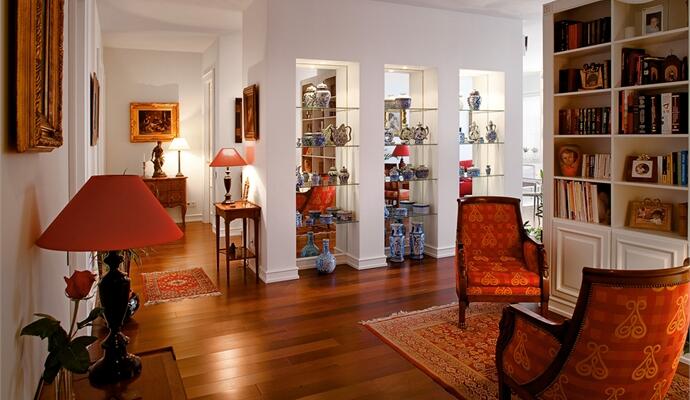 Здесь нет «чужих» вещей, лишних или надуманных. Большая их часть перекочевала на новую родину из предыдущего дома во Франции. К тому же на этапе декорирования хозяин сам выступал непосредственным участником процесса. Когда проект начинался, заказчик высказал лишь несколько пожеланий: грамотно и интересно зонировать пространство (в котором свободно разместились бы объединенная гостиная-столовая-кухня, спальня, две детских, ванная комната и гостевой санузел) и все стены сделать белыми. Дальше «сценография» выстраивалась так, как того требовало место и…предметы. Прямо с порога открывается выверенная классика: антикварные тумбы и консоли, ручной работы восточные ковры, картины в золоченых рамах, коллекция фарфора и мини-библиотека — аристократичный уголок с классическими креслами. О том, что это лишь игра в большой стиль — очень тонкая и ироничная — понимаешь не сразу, по мере изучения пространства. Так, первый шок, не укладывающийся в ожидаемый образ, — это откровенно современный, даже (не побоимся этого слова) дерзкий, красный диван в гостиной.